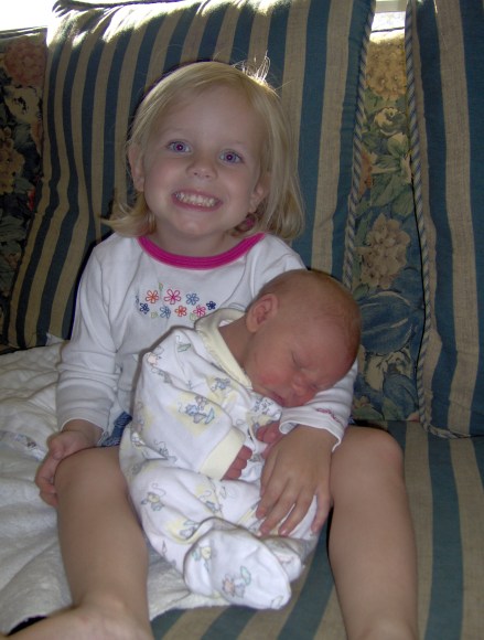 When Knox was born, Emma was 3 yrs and 3 months, yet she was the big sister of not just one brother but two! She found it a bit frustrating to not get to hold him as much as Elizabeth and Anne Michal much less carry him around. As you can see,however, she delighted in holding him.